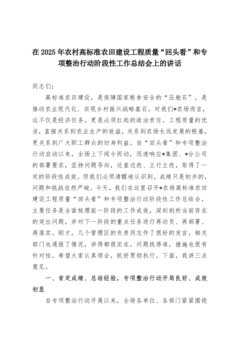 在2025年农村高标准农田建设工程质量“回头看”和专项整治行动阶段性工作总结会上的讲话