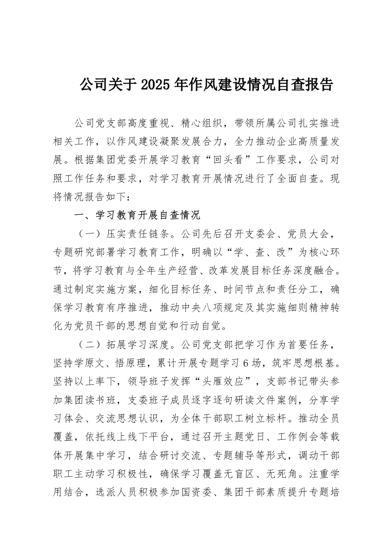 首页学习提升公司关于2025年作风建设情况自查报告