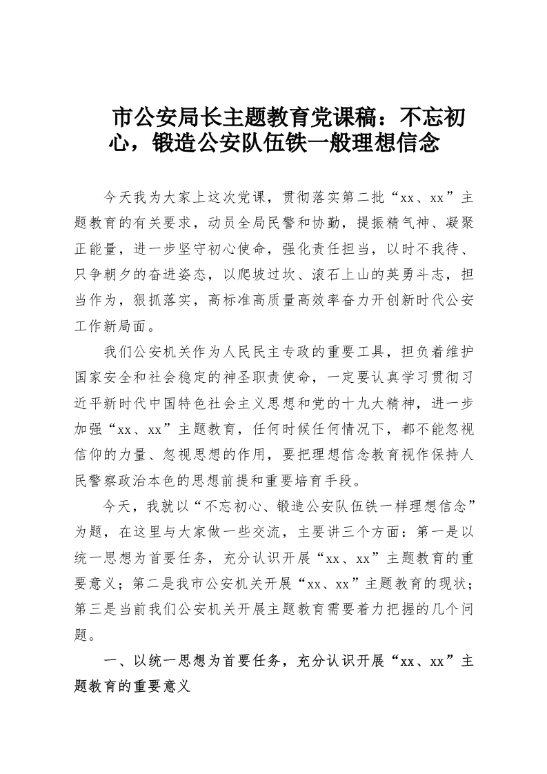市公安局长主题教育党课稿:不忘初心,锻造公安队伍铁一般理想信念