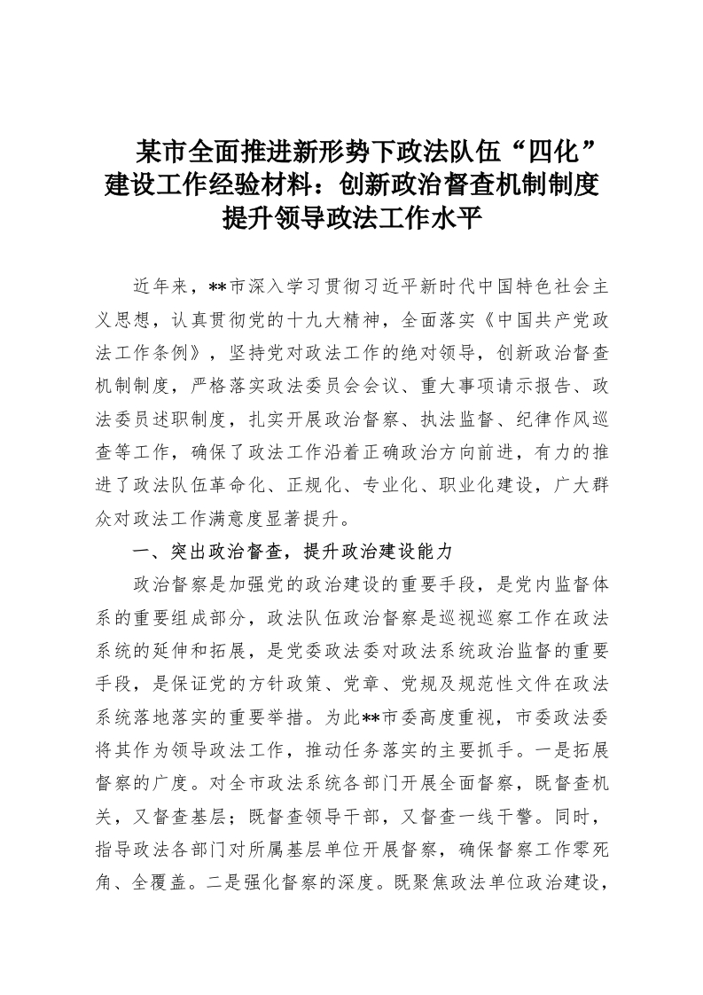 某市全面推进新形势下政法队伍“四化”建设工作经验材料:创新政治督查机制制度 提升领导政法工作水平