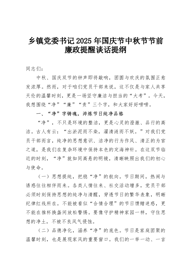 乡镇党委书记2025年国庆节中秋节节前廉政提醒谈话提纲