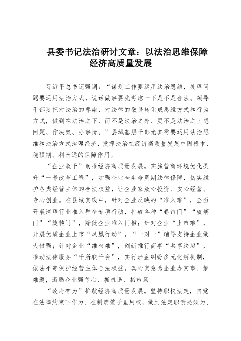 县委书记法治研讨文章:以法治思维保障经济高质量发展