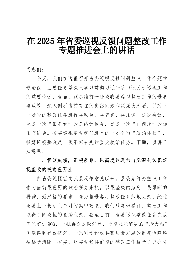 在2025年省委巡视反馈问题整改工作专题推进会上的讲话