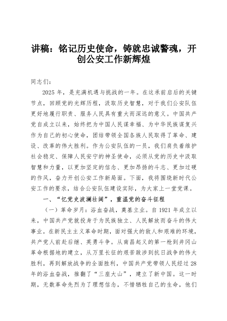 首页学习提升讲稿:铭记历史使命,铸就忠诚警魂,开创公安工作新辉煌