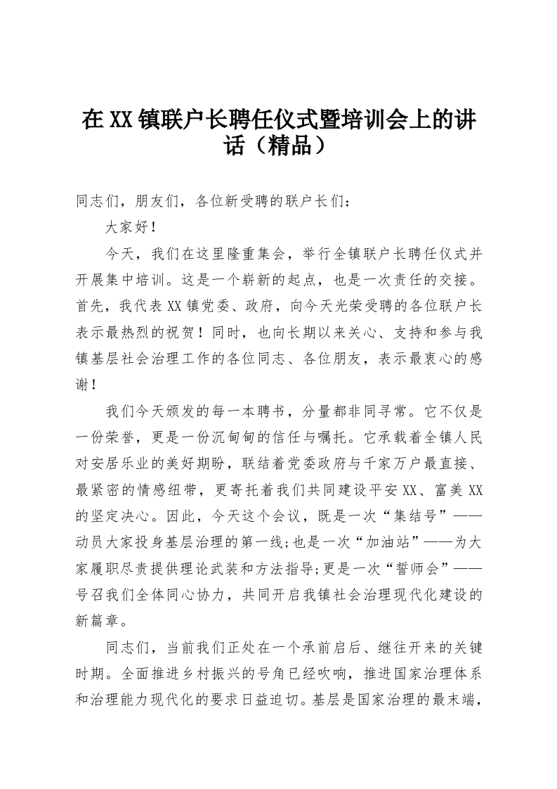在XX镇联户长聘任仪式暨培训会上的讲话(精品)