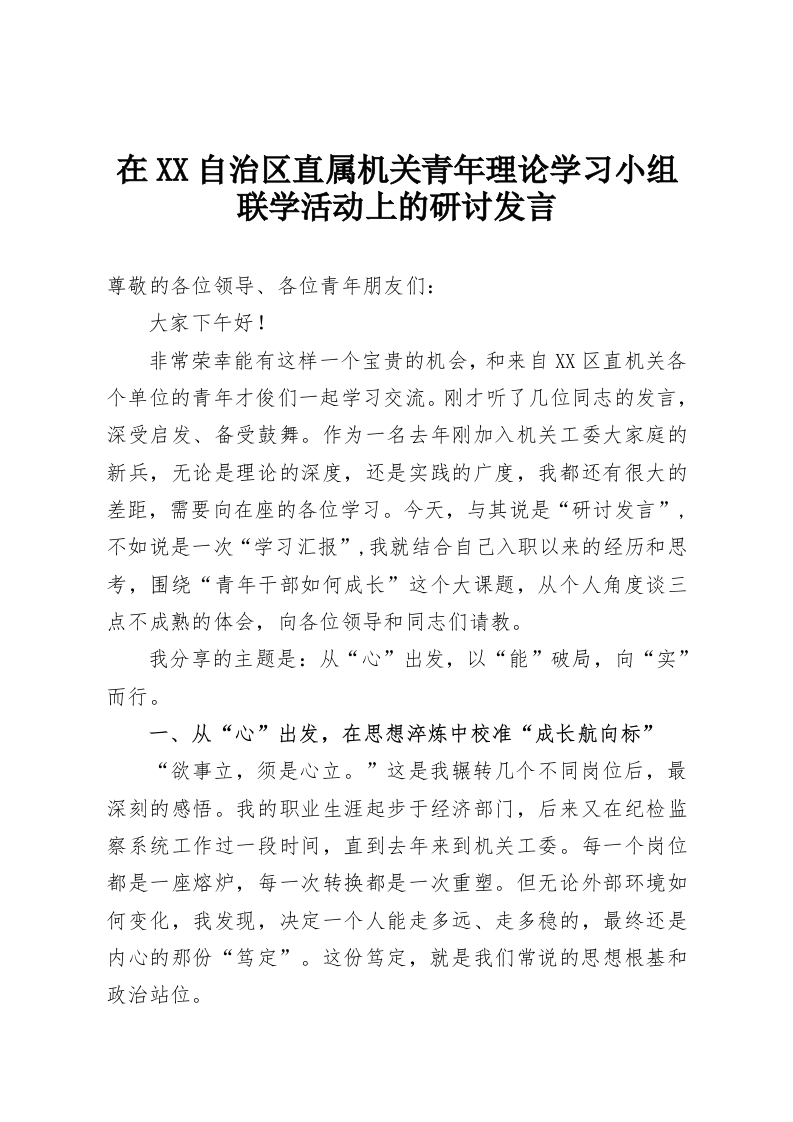 在XX自治区直属机关青年理论学习小组联学活动上的研讨发言