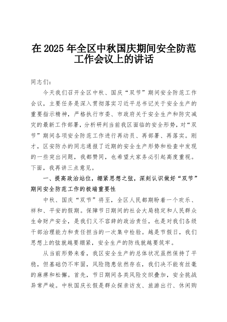 在2025年全区中秋国庆期间安全防范工作会议上的讲话