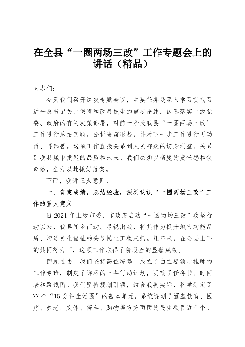 在全县“一圈两场三改”工作专题会上的讲话(精品)