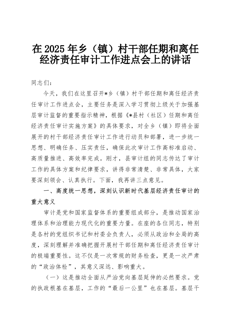 在2025年乡(镇)村干部任期和离任经济责任审计工作进点会上的讲话