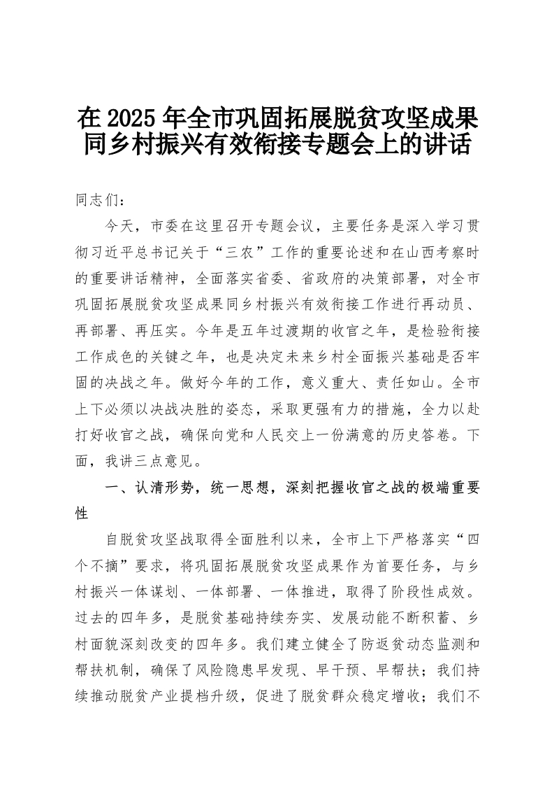 在2025年全市巩固拓展脱贫攻坚成果同乡村振兴有效衔接专题会上的讲话