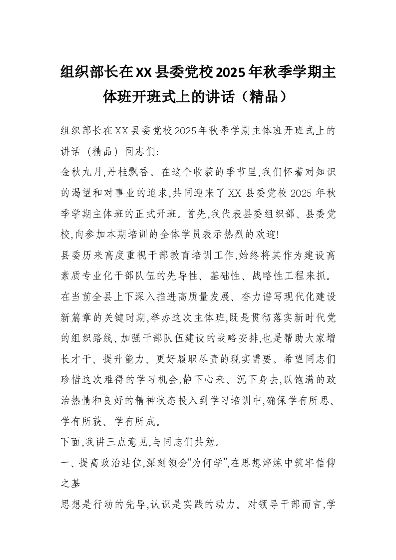 组织部长在XX县委党校2025年秋季学期主体班开班式上的讲话(精品)