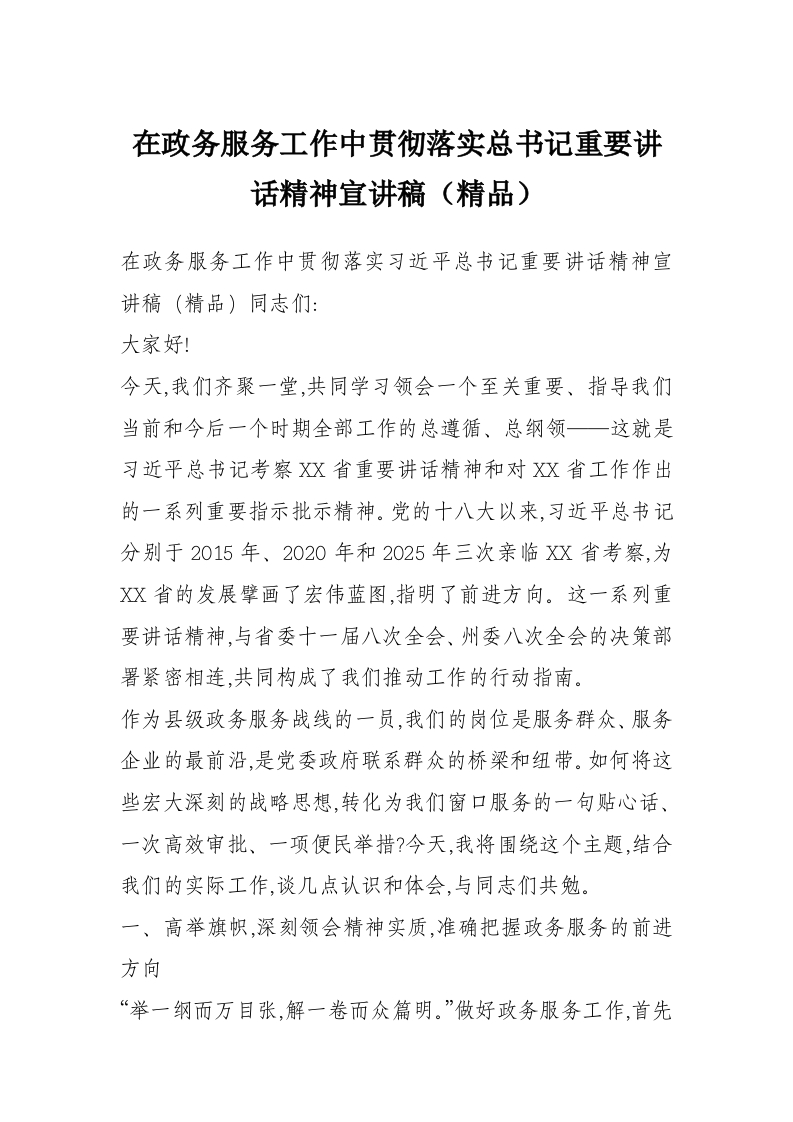 在政务服务工作中贯彻落实总书记重要讲话精神宣讲稿(精品)