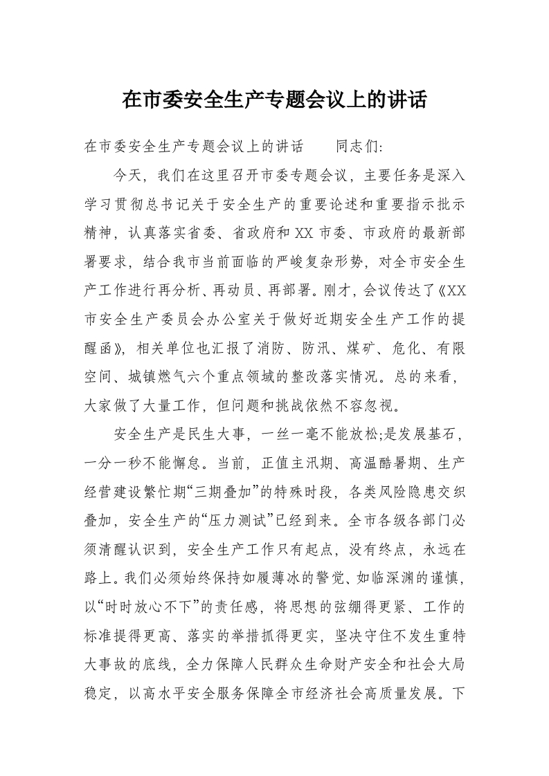 在市委安全生产专题会议上的讲话