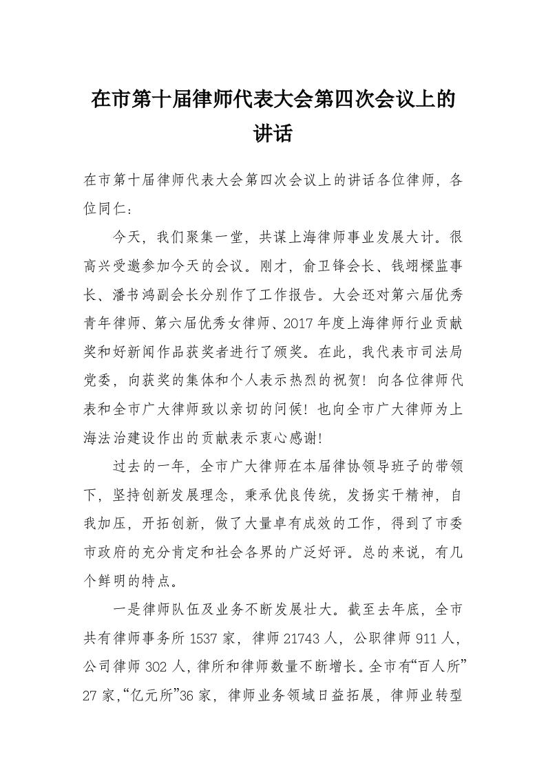 在市第十届律师代表大会第四次会议上的讲话