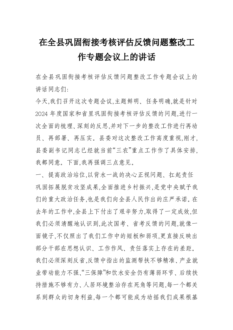 首页精选范文在全县巩固衔接考核评估反馈问题整改工作专题会议上的讲话