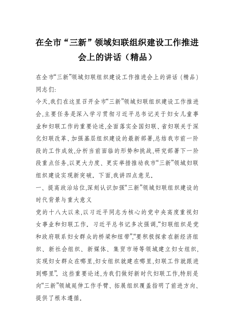 在全市“三新”领域妇联组织建设工作推进会上的讲话(精品)