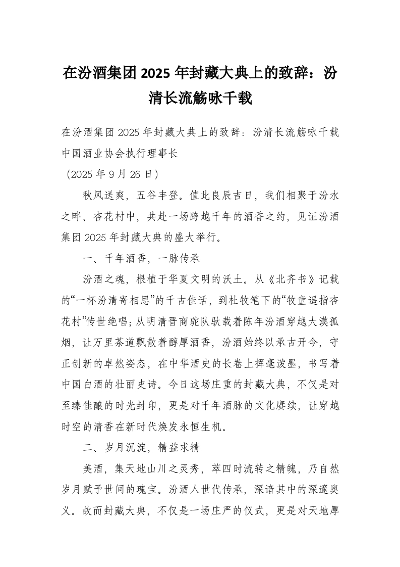 首页精选范文在汾酒集团2025年封藏大典上的致辞:汾清长流觞咏千载