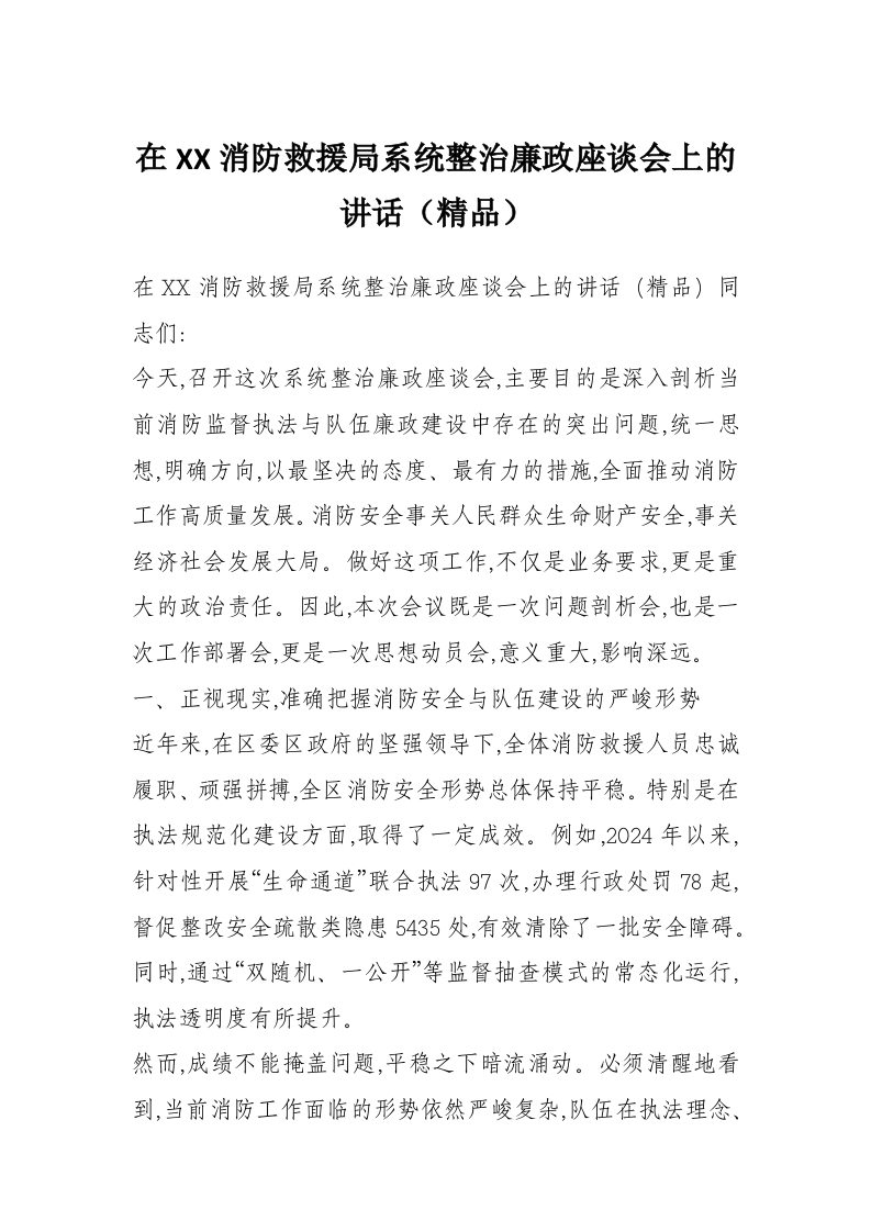 在XX消防救援局系统整治廉政座谈会上的讲话(精品)
