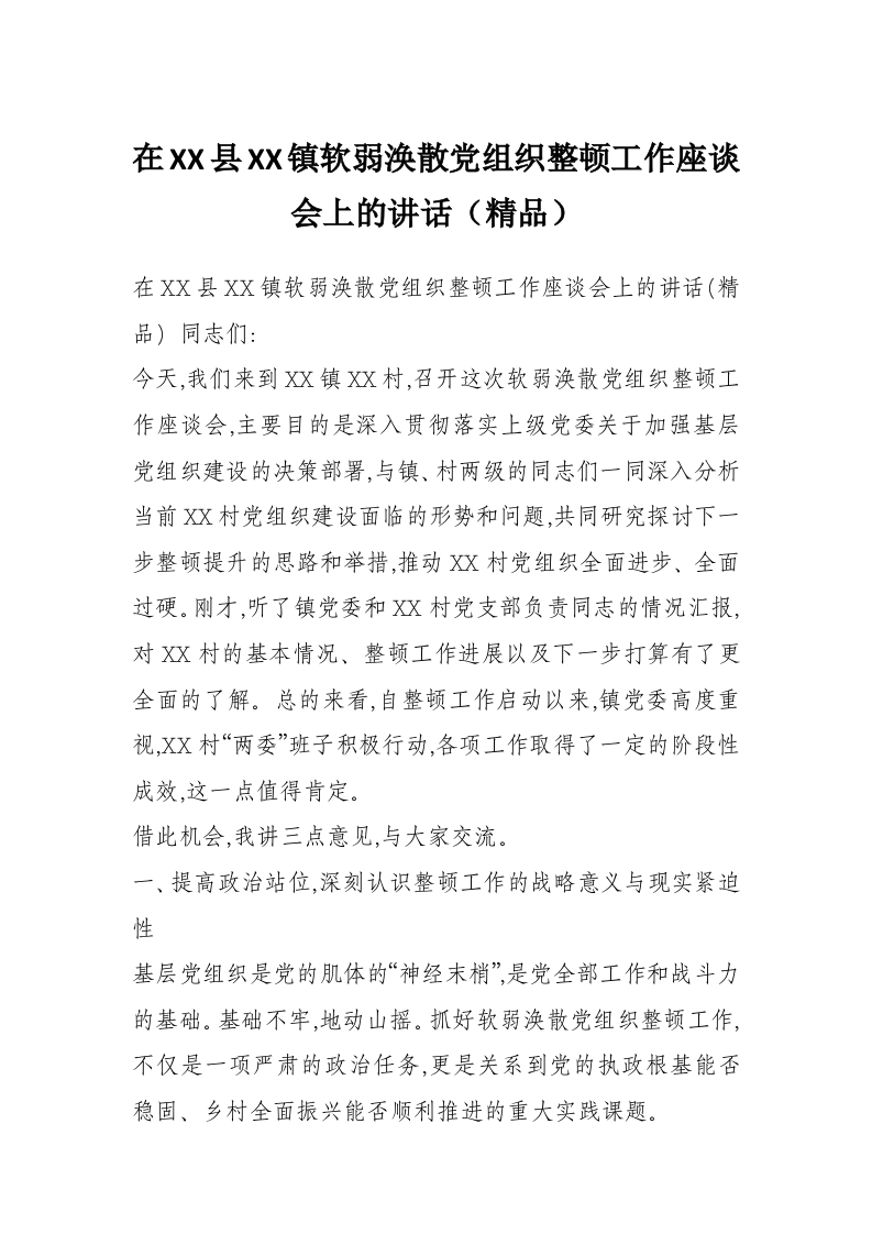 在XX县XX镇软弱涣散党组织整顿工作座谈会上的讲话(精品)