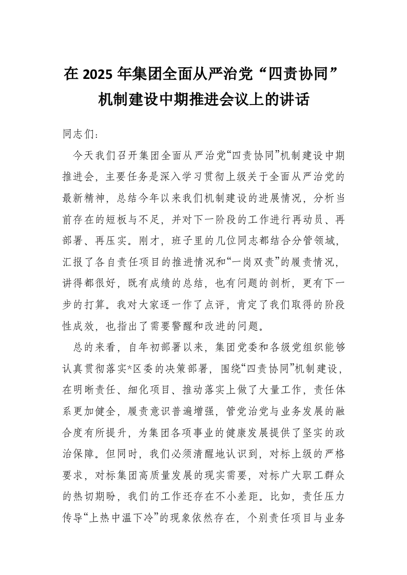 首页讲课讲稿在2025年集团全面从严治党“四责协同”机制建设中期推进会议上的讲话