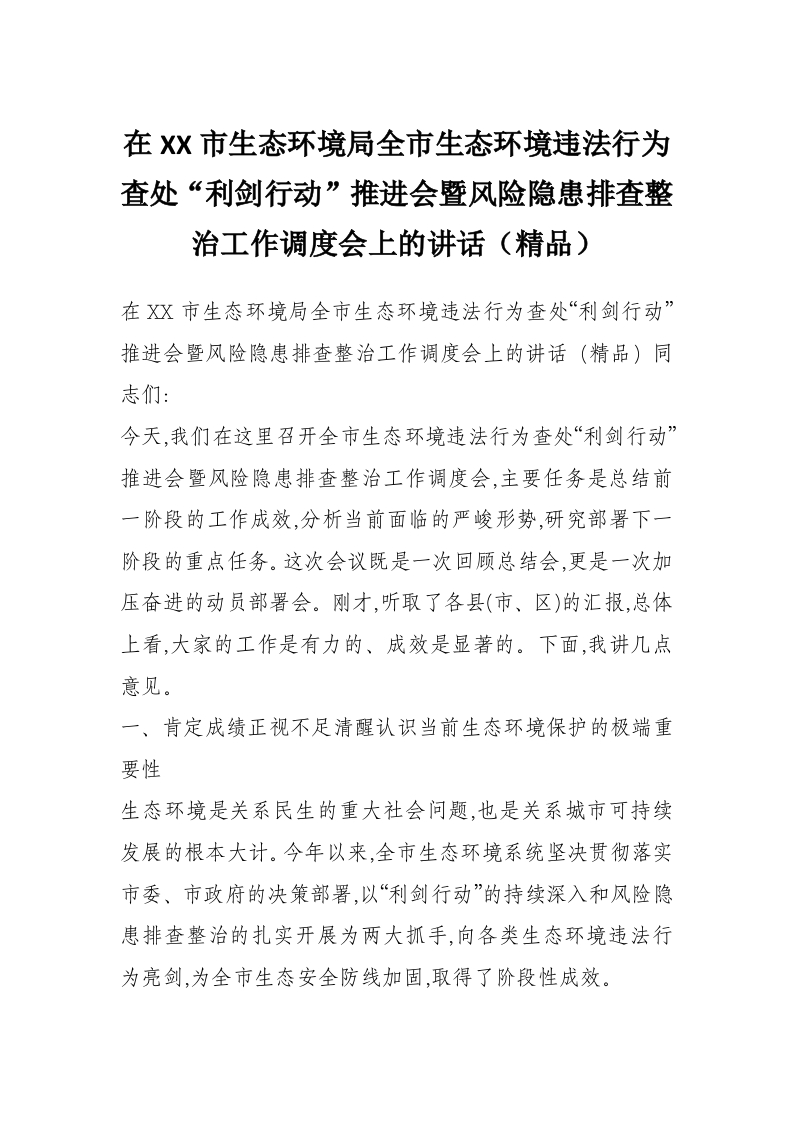 在XX市生态环境局全市生态环境违法行为查处“利剑行动”推进会暨风险隐患排查整治工作调度会上的讲话(精品)