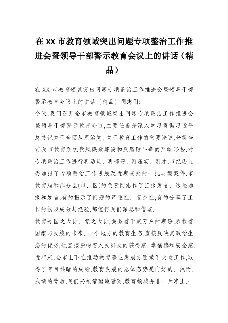 在XX市教育领域突出问题专项整治工作推进会暨领导干部警示教育会议上的讲话(精品)