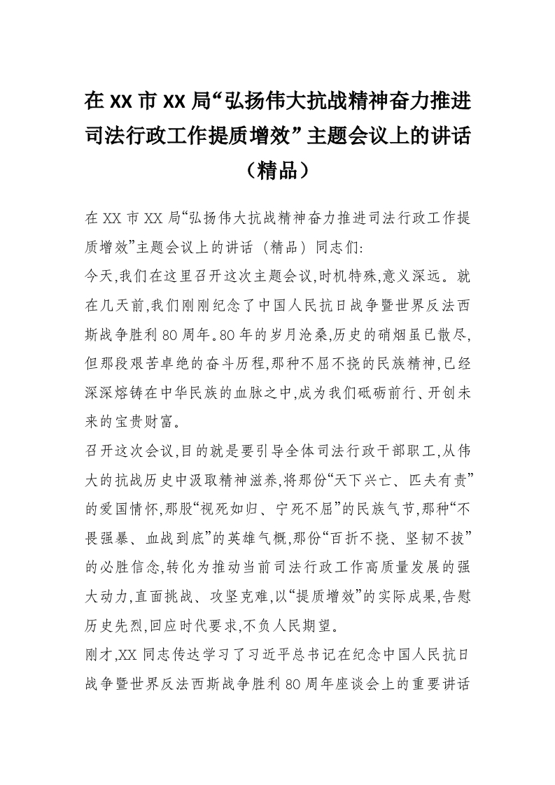 在XX市XX局“弘扬伟大抗战精神奋力推进司法行政工作提质增效”主题会议上的讲话(精品)