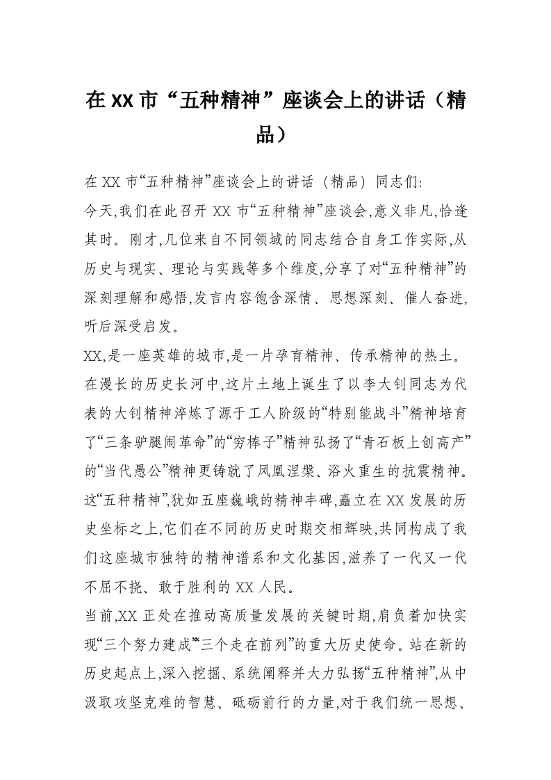 在XX市“五种精神”座谈会上的讲话(精品)
