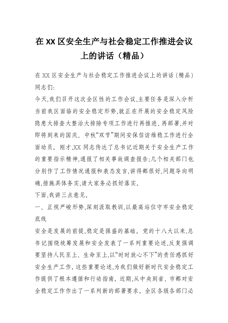 在XX区安全生产与社会稳定工作推进会议上的讲话(精品)