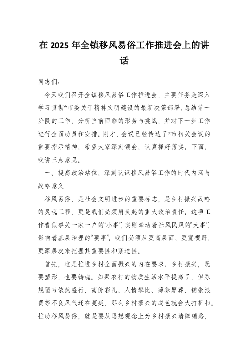 在2025年全镇移风易俗工作推进会上的讲话