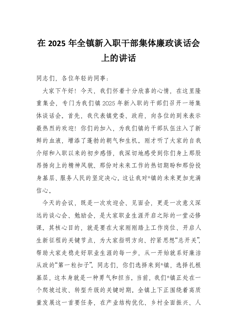 在2025年全镇新入职干部集体廉政谈话会上的讲话
