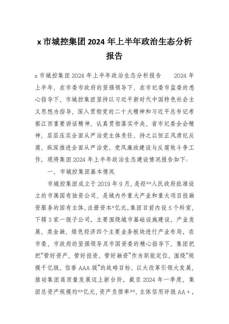 首页材料汇编x市城控集团2024年上半年政治生态分析报告