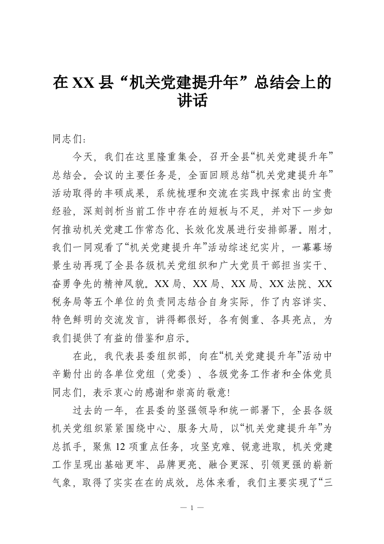 首页精选范文在XX县“机关党建提升年”总结会上的讲话