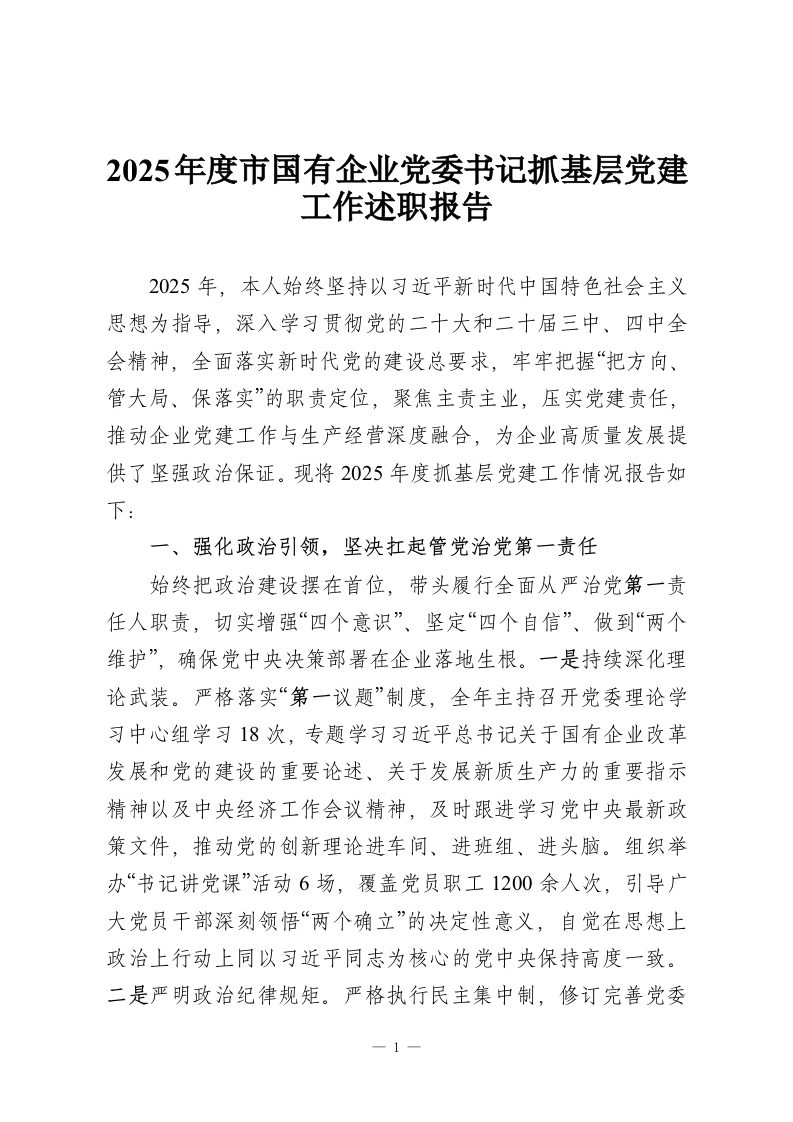2025年度市国有企业党委书记抓基层党建工作述职报告