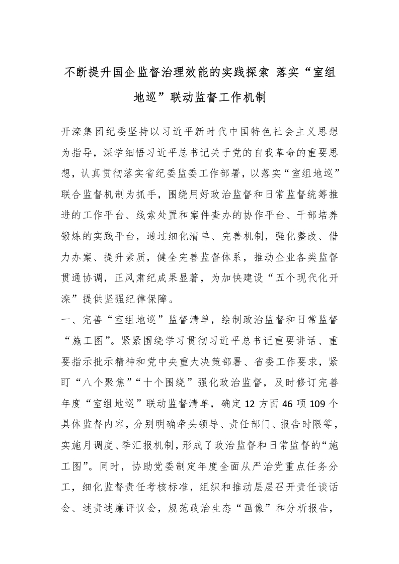 首页精选范文不断提升国企监督治理效能的实践探索 落实“室组地巡”联动监督工作机制_副本