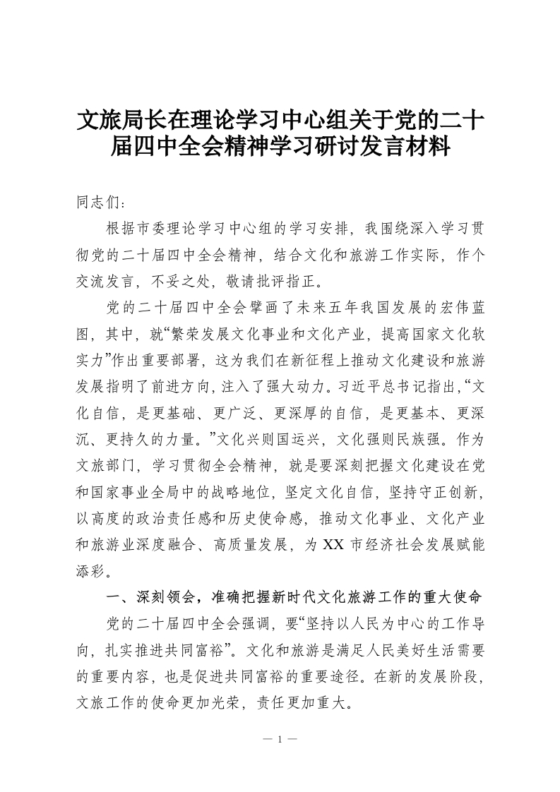 首页精选范文文旅局长在理论学习中心组关于党的二十届四中***精神学习研讨发言材料