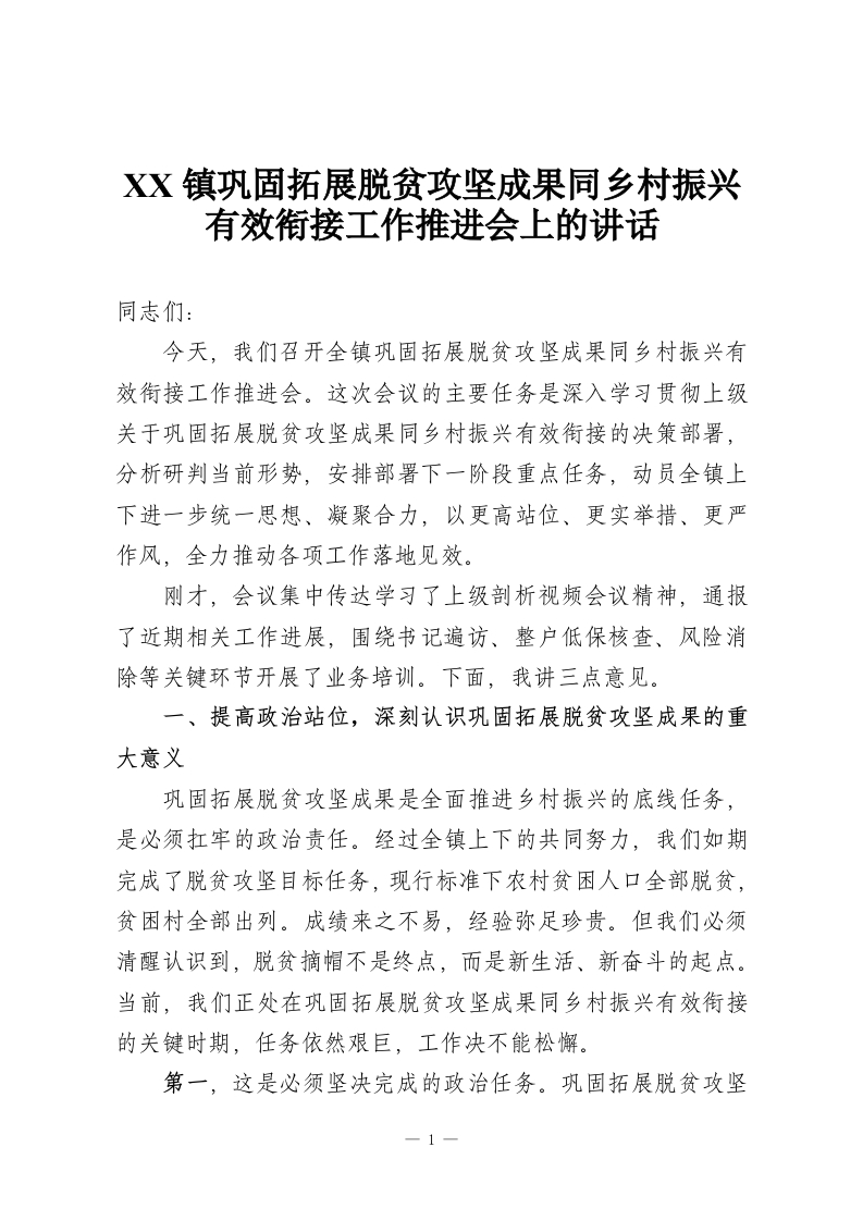 XX镇巩固拓展脱贫攻坚成果同乡村振兴有效衔接工作推进会上的讲话