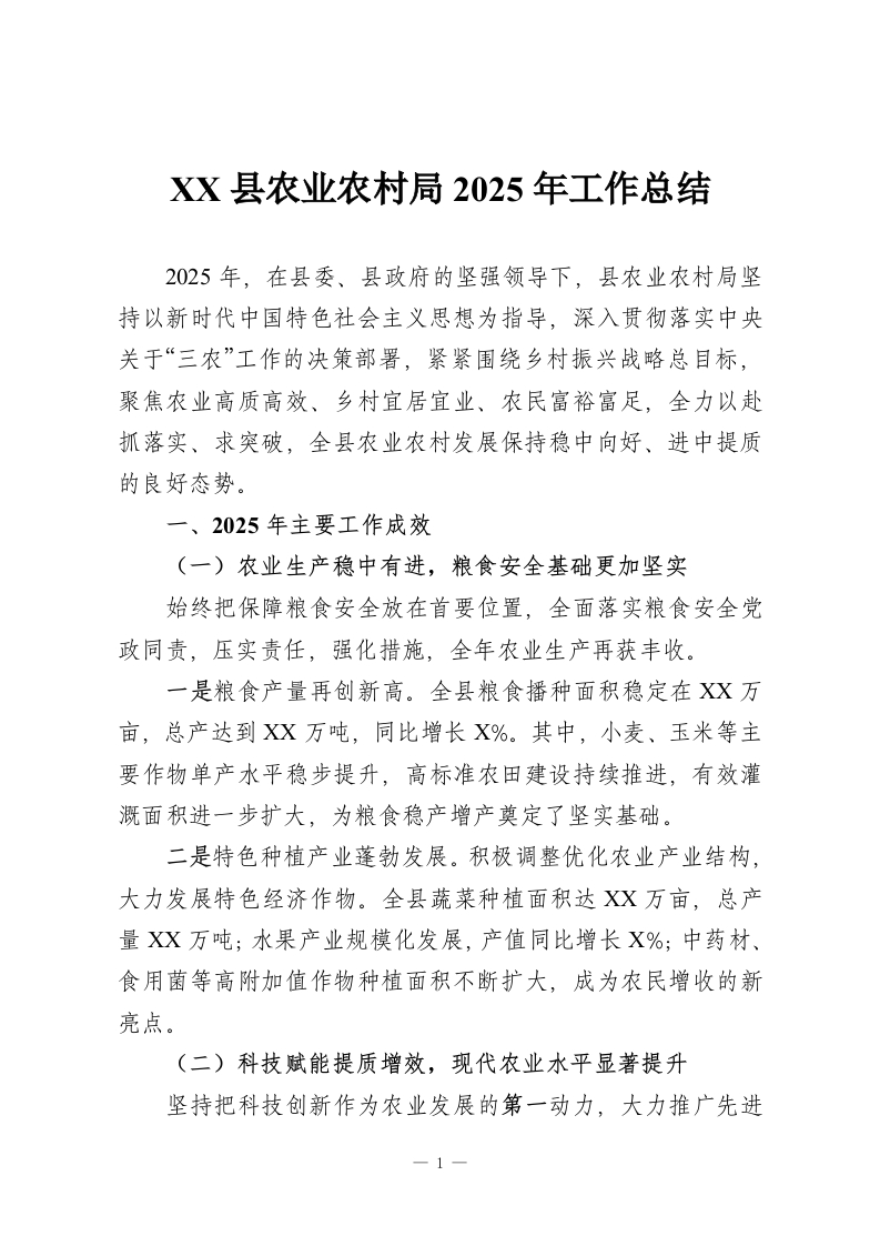 XX县农业农村局2025年工作总结