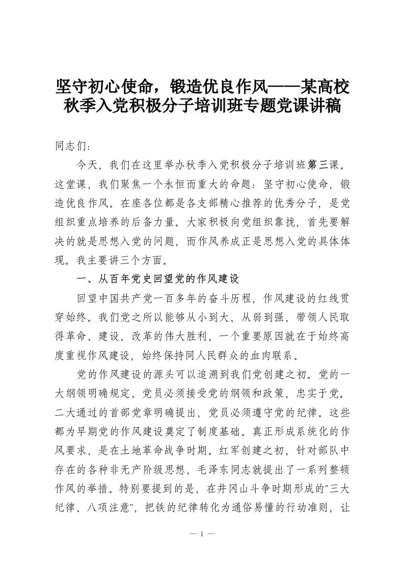 坚守初心使命,锻造优良作风——某高校秋季入党积极分子培训班专题党课讲稿