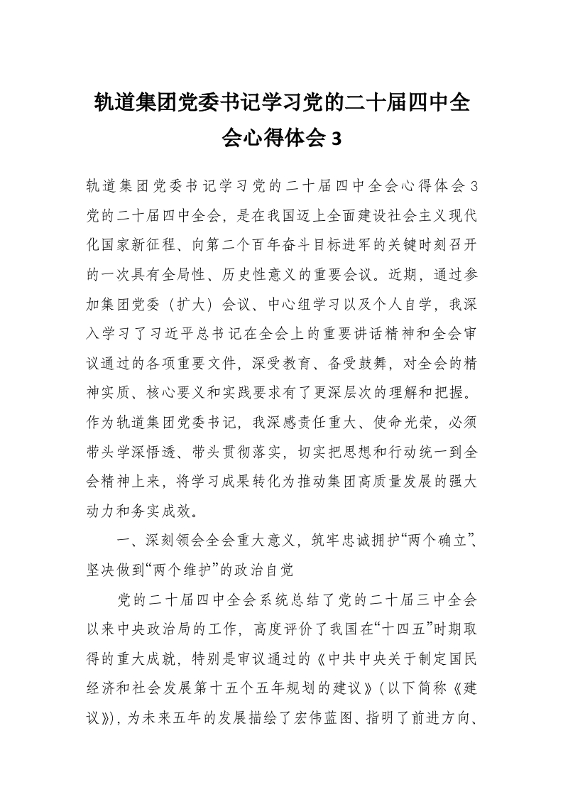 轨道集团党委书记学习党的二十届四中***心得体会3