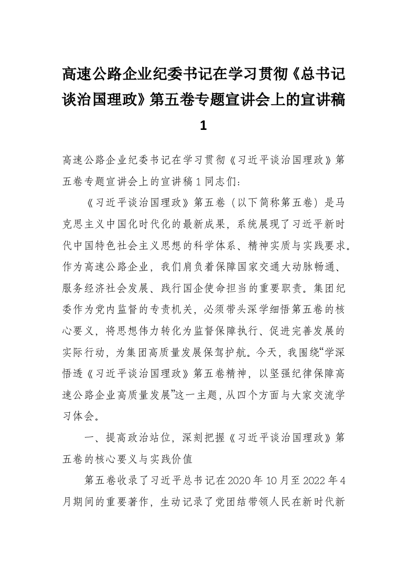 高速公路企业纪委书记在学习贯彻《总书记谈治国理政》第五卷专题宣讲会上的宣讲稿1