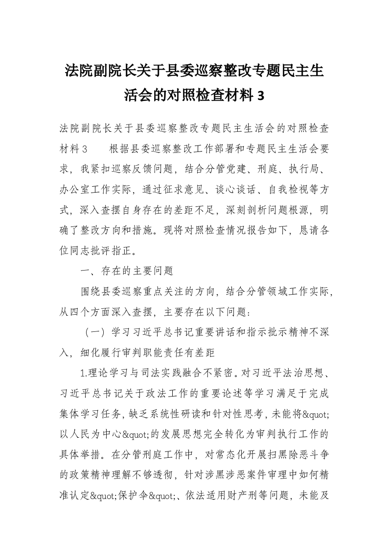 首页写作素材法院副院长关于县委巡察整改专题民主生活会的对照检查材料3
