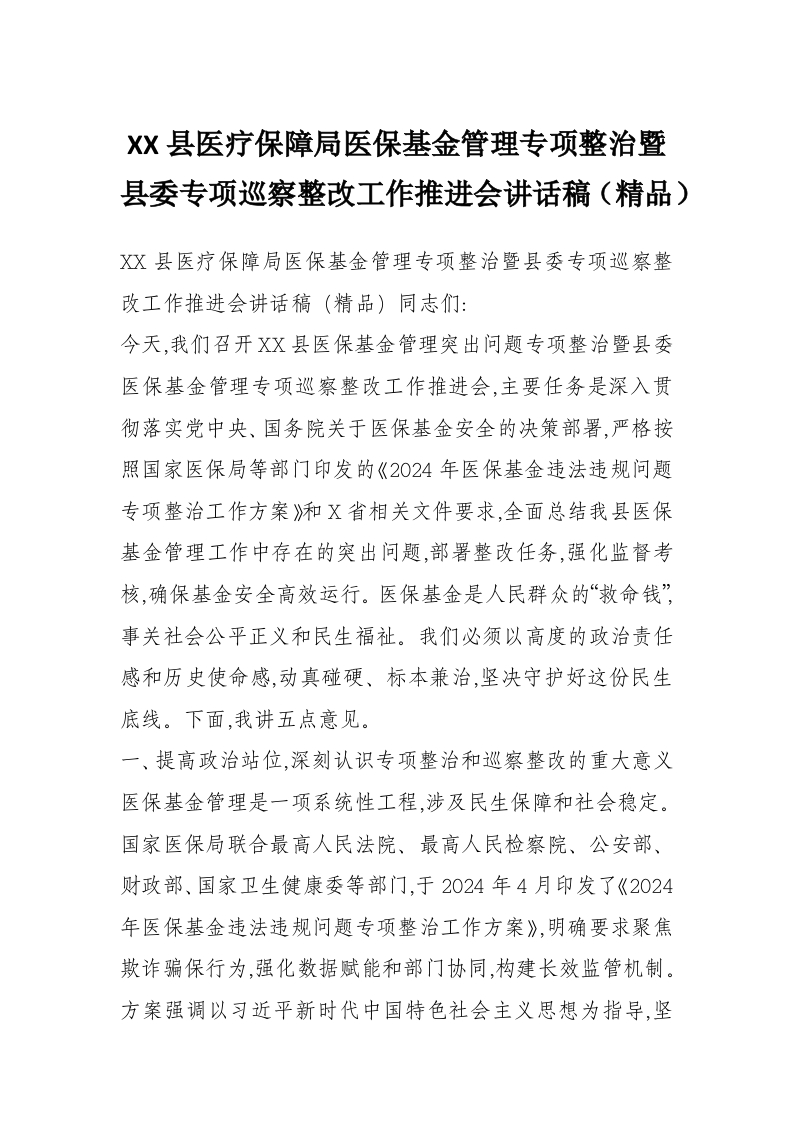 XX县医疗保障局医保基金管理专项整治暨县委专项巡察整改工作推进会讲话稿(精品)