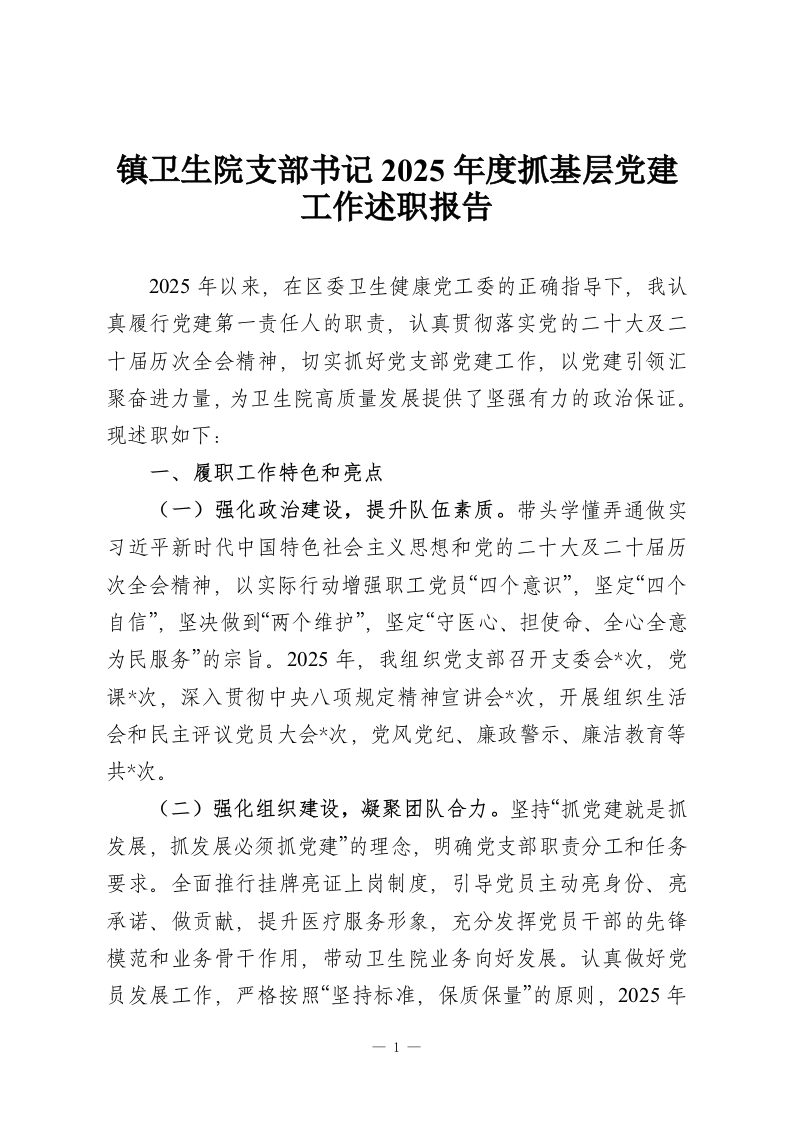 镇卫生院支部书记2025年度抓基层党建工作述职报告