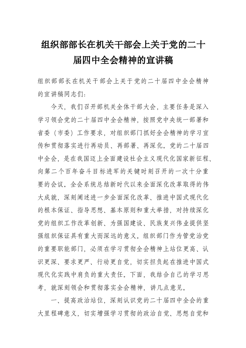 组织部部长在机关干部会上关于党的二十届四中***精神的宣讲稿