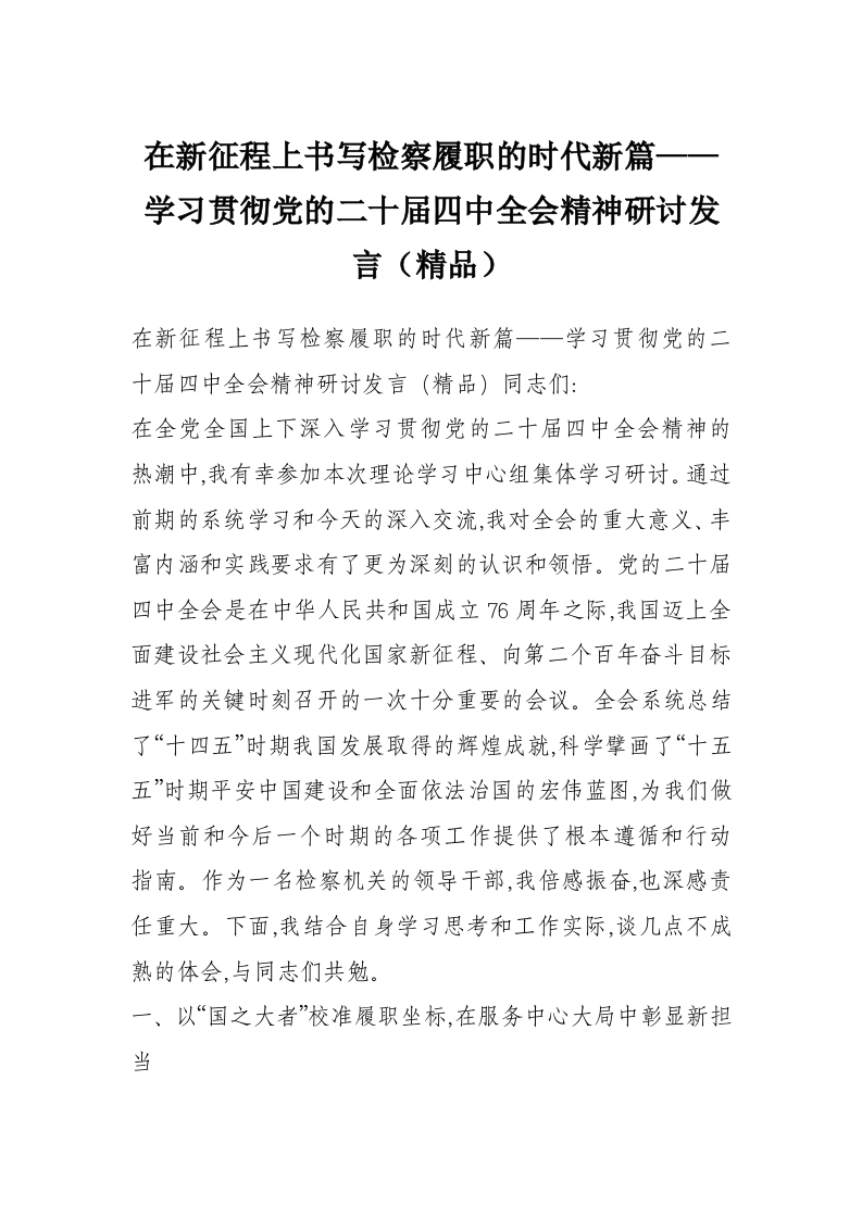在新征程上书写检察履职的时代新篇——学习贯彻党的二十届四中***精神研讨发言(精品)