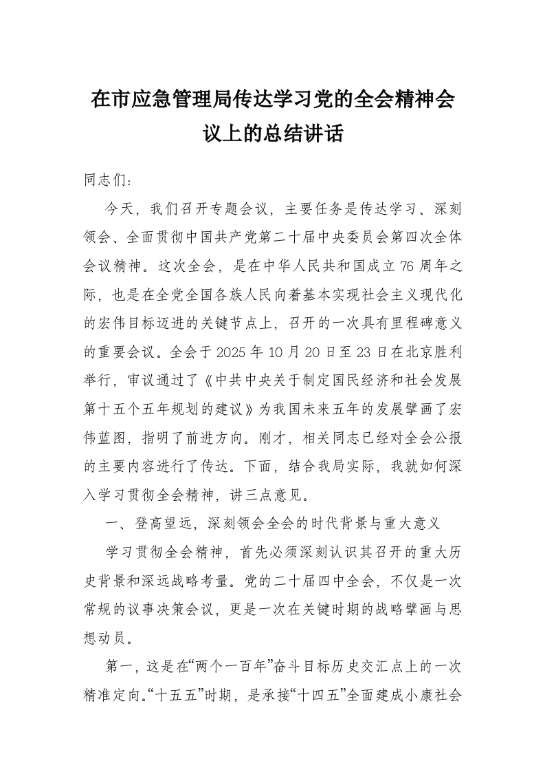 首页精选范文在市应急管理局传达学习党的***精神会议上的总结讲话