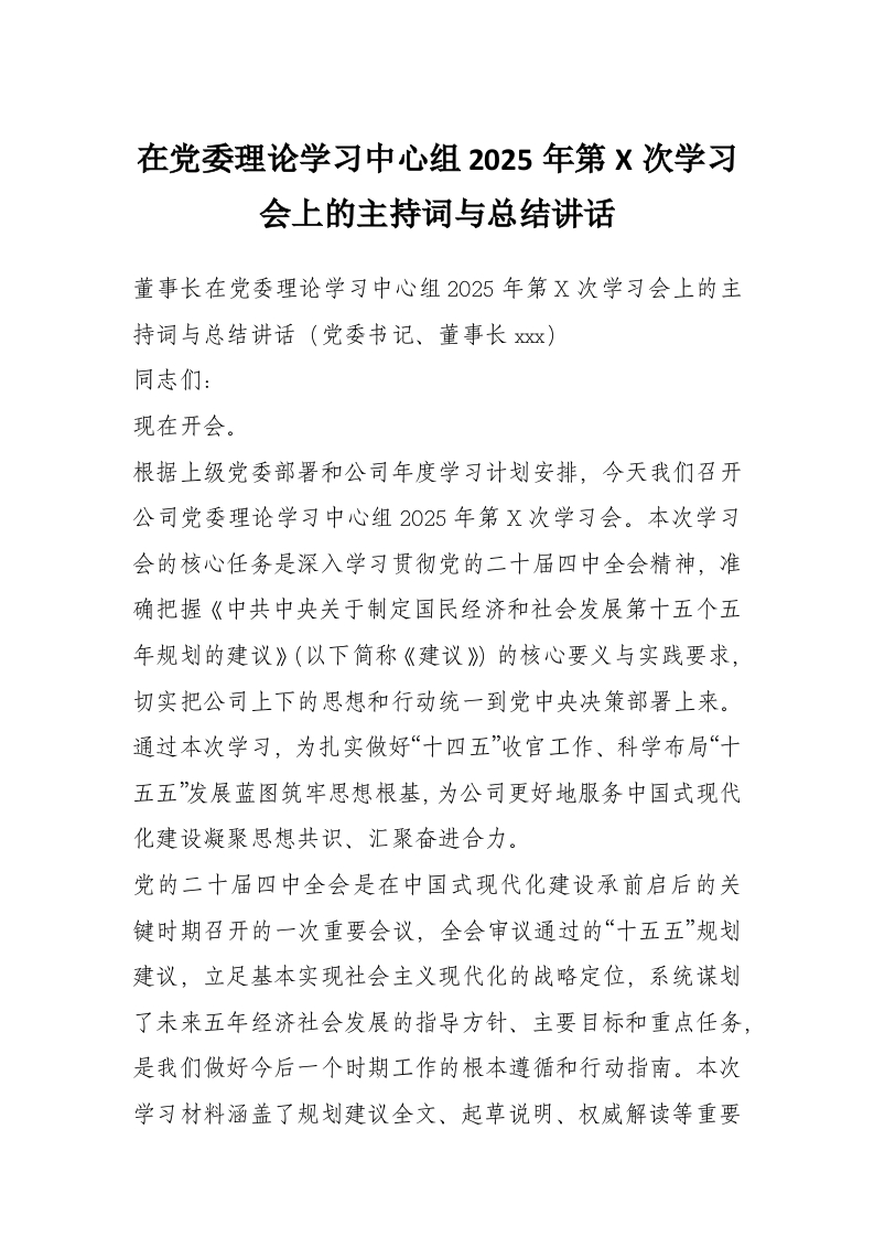 在党委理论学习中心组2025年第X次学习会上的主持词与总结讲话