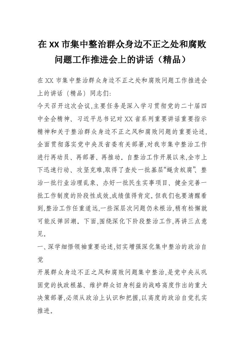 在XX市集中整治群众身边不正之处和腐败问题工作推进会上的讲话(精品)