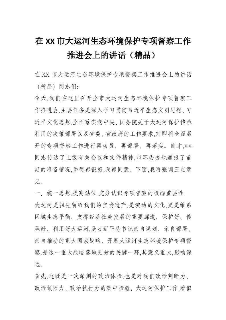 在XX市大运河生态环境保护专项督察工作推进会上的讲话(精品)